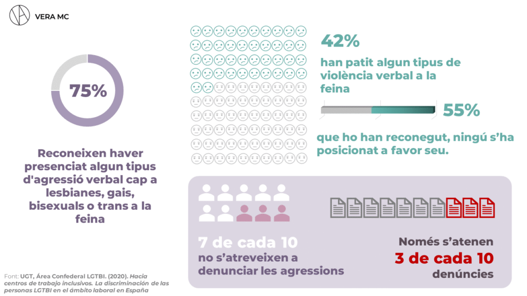 Així es posava de manifest amb l’estudi de “La discriminació de les persones LGTBI en l’àmbit laboral a Espanya“, elaborat per la UGT i la FELGTB, on el 75% de les persones consultades reconeixen haver presenciat algun tipus d’agressió verbal cap a lesbianes, gais, bisexuals o trans a la feina.