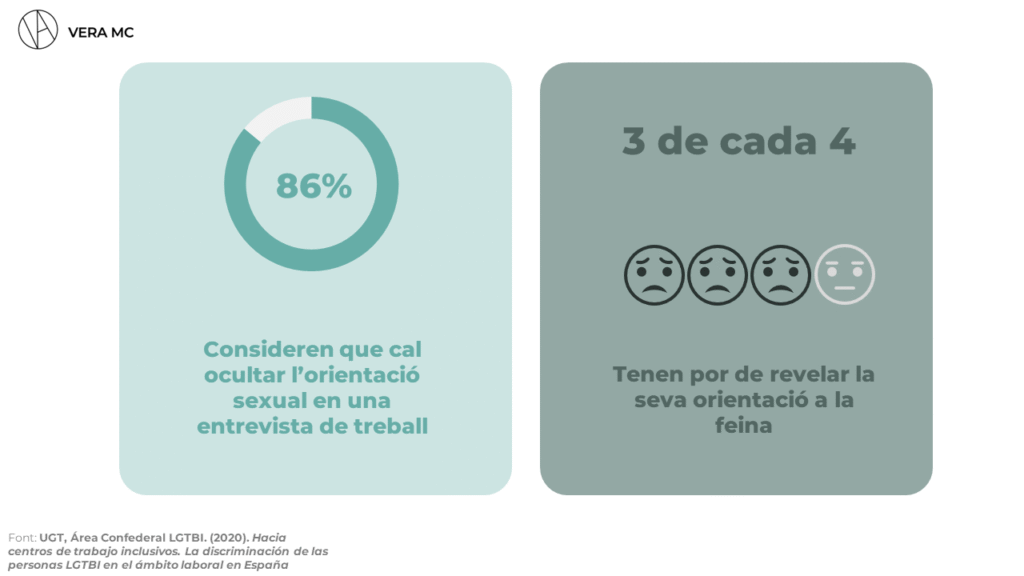 La normalitat d’aquesta violència i la falta d’actuació davant de les situacions de discriminació que viuen les persones del col·lectiu LGTBI condueixen a l’encobriment de l’orientació: el 86% de les persones enquestades creuen que cal ocultar l’orientació sexual en una entrevista de treball, i tres de cada quatre persones LGTBI han tingut por alguna vegada a revelar la seva orientació a la feina.