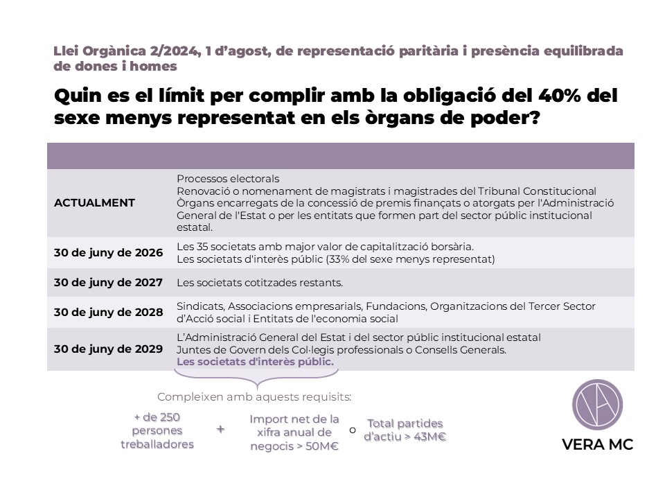 Pel que fa al compliment de la paritat, aquest serà exigible per les empreses de l’IBEX 35 el 30 de juny de 2026, per la resta d’empreses cotitzades el 30 de juny de 2027 i per les empreses d’interès públic el 30 de juny de 2029. Les empreses d’interès públic són aquelles que tenen més de 250 persones treballadores i compleixen amb alguna d’aquestes condicions: tenir un import net de la xifra de negocis de més de 50 milions d’euros o bé tenir un total de partides en actiu de més de 43 milions.