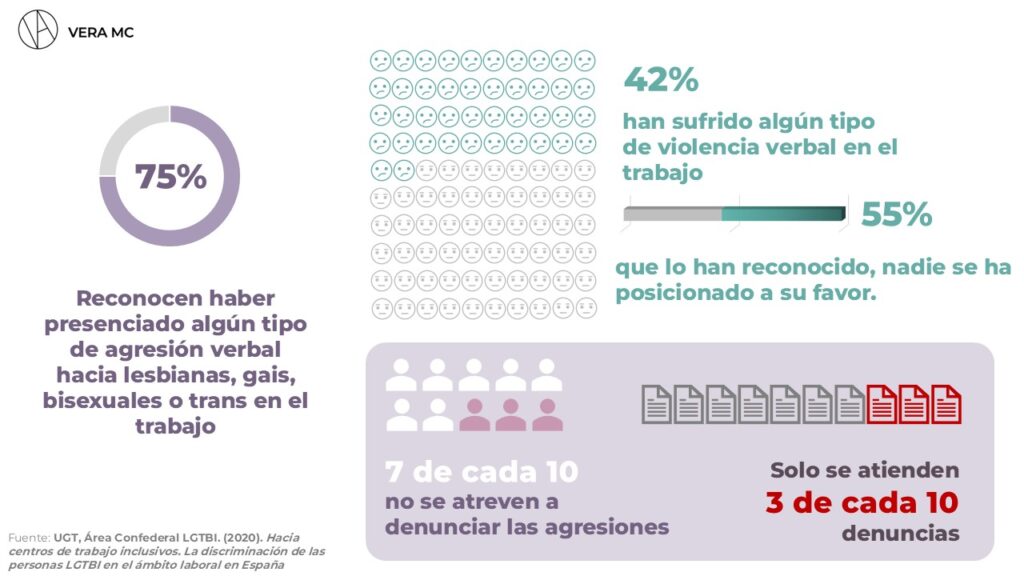 Así lo pone de manifiesto el estudio «La discriminación de las personas LGTBI en el ámbito laboral en España«, elaborado por UGT y FELGTB, donde el 75% de las personas encuestadas reconocen haber presenciado algún tipo de agresión verbal hacia lesbianas, gais, bisexuales o trans en el trabajo.