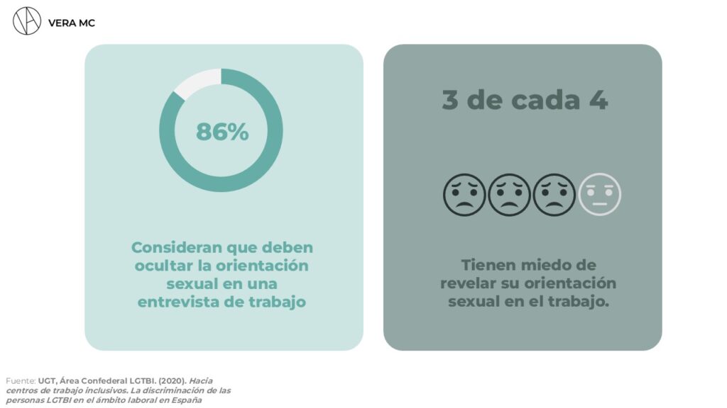 La normalización de esta violencia y la falta de actuación frente a las situaciones de discriminación que viven las personas del colectivo LGTBI conducen al encubrimiento de la orientación: el 86% de las personas encuestadas creen que es necesario ocultar su orientación sexual en una entrevista de trabajo, y tres de cada cuatro personas LGTBI han sentido miedo alguna vez de revelar su orientación en el trabajo.
